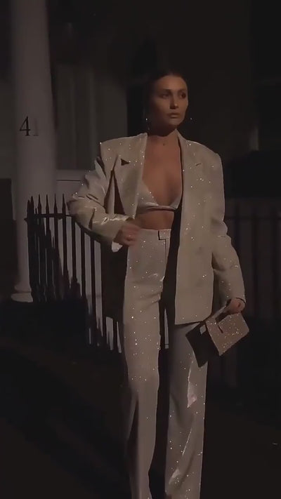 Bereit zu glänzen? Das Bella-Dreiteiler-Set ist dein Go-To für jede Glam-Season. Funkelnder Glitzer, ein kraftvoller Oversized-Blazer und ein sexy tief ausgeschnittenes Crop-Top ergeben zusammen einen Look, der Eleganz, Selbstbewusstsein und Attitude ausstrahlt. Ob Party, Dinner oder Girls Night Out – mit Bella bist du der Star des Abends.