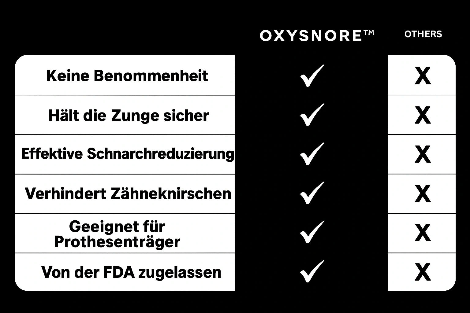 Das OxySnore™ unterstützt erholsamen Schlaf, indem es die Zunge sanft in Position hält, Blockierungen verhindert und die Vibrationen minimiert, die Schnarchen verursachen. Dadurch werden die Sauerstoffwerte optimiert – für bessere Erholung, geistige Klarheit und ein stärkeres Immunsystem. Durch die Stabilisierung der Atmung kann zudem der REM-Schlaf verbessert werden, was das Gedächtnis und das emotionale Wohlbefinden fördert.