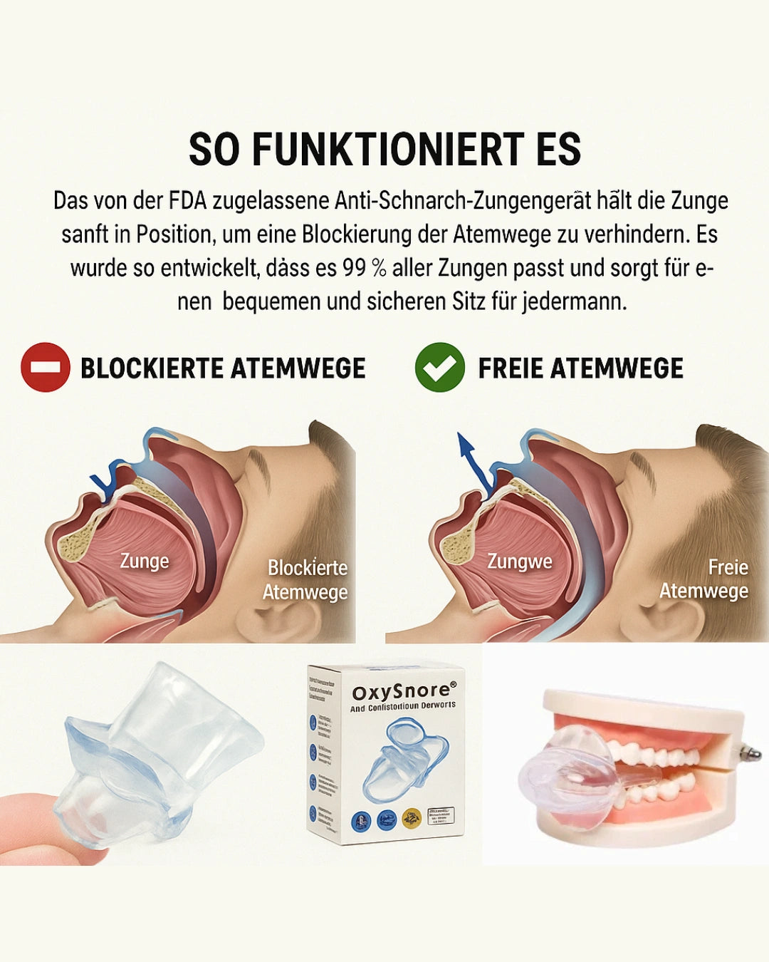 Das FDA-zugelassene OxySnore™ verfügt über eine innovative Technologie, die die Zunge sanft in Position hält und so verhindert, dass sie die Atemwege blockiert oder in den Rachen zurückfällt. Durch die Stabilisierung der Zunge trägt das Gerät dazu bei, die Atemwege offen zu halten und die Wahrscheinlichkeit von schnarchbedingten Blockierungen zu reduzieren.